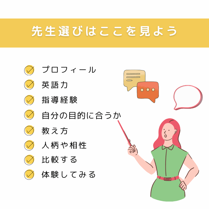 先生選びが、この先の英語の上達度を決めると言っても過言ではありません。時間をかけて納得のいく先生を選びましょう。