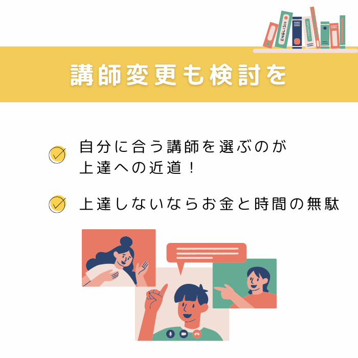 レッスンの教え方やコミュニケーションが上手くいかない先生とは早めに変更し、複数のレッスンを受けながら自分にマッチする講師を探すようにしましょう。