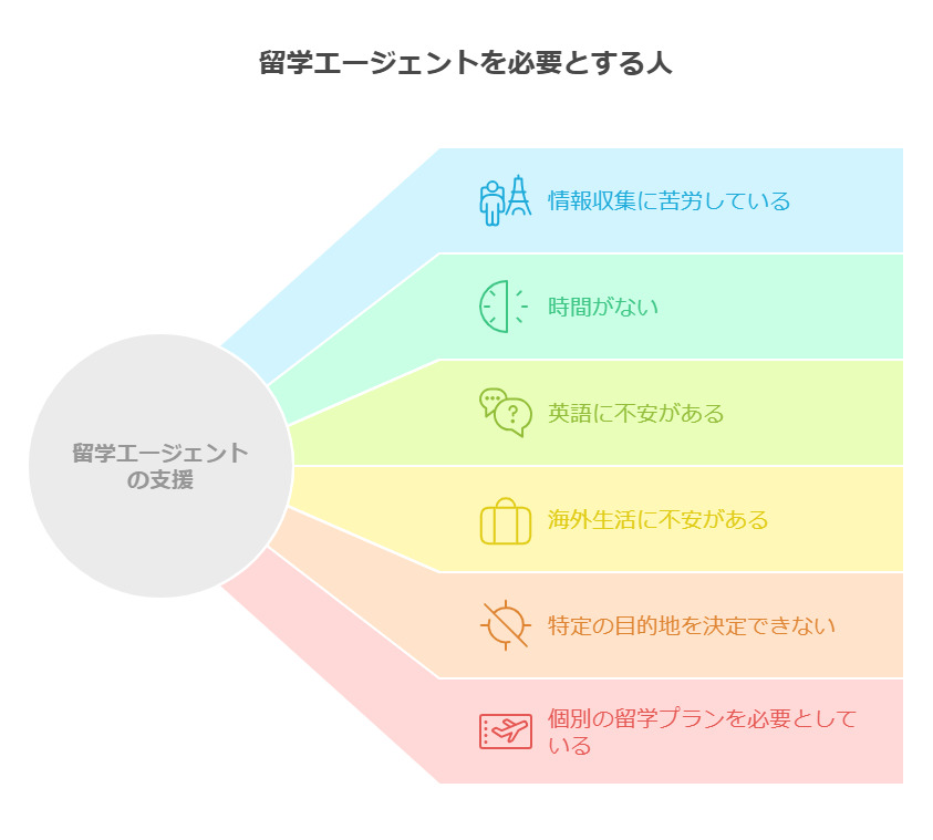留学エージェントを使うと、学校選びからビザ申請、生活準備まで専門的なサポートが受けられ、スムーズで安心な留学準備が可能になります。