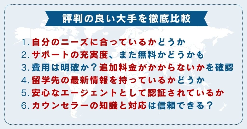 それゆえに、留学が成功するかどうかの重要なカギを握っているとも言えますので、エージェント選びは後悔のないよう慎重に行いましょう。