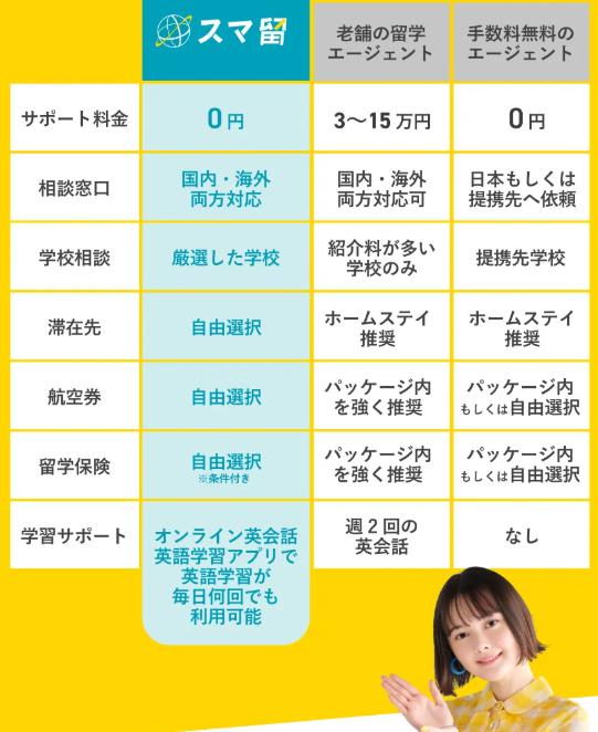 スマ留は、他社と比べて最大半額の留学費用、シンプルな料金体系、充実した英語学習サポート、安心のサポート体制でおすすめできる留学エージェントです。