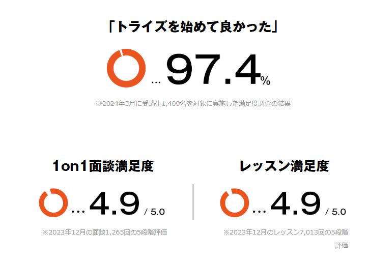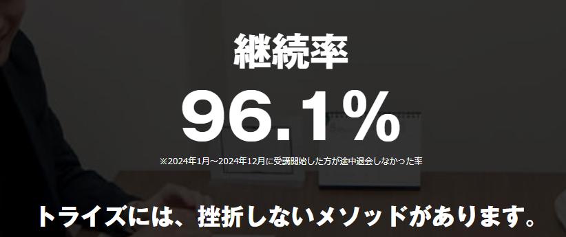 トライズの学習継続率は驚異の96.1%を誇り、受講生満足度は97.9%という非常に高い数字を記録しています。