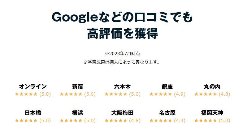 | スクール数 | 7校(東京、神奈川、名古屋、大阪、福岡、オンライン対応) |