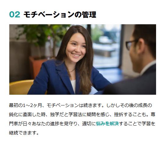 学習スタイルや目標に合わせたサポートが得られるため、自分のペースで進めたい方や、特定のスキルを重点的に伸ばしたい方には特に効果的です。専任のコーチが進捗を見守り、適切なアドバイスをくれるので、安心して学べます。